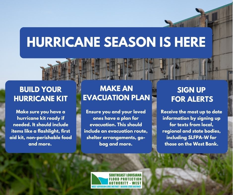 Hurricane season has arrived! Prepare ahead of time at getagameplan.org, and stay updated during weather events by signing up for texts from SLFPA-W.
